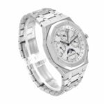 The Audemars Piguet Royal Oak Perpetual Replica is a striking watch. It features a 904L stainless steel case and bezel. with a sapphire crystal and adjustable links. The movement is an automatic AP 5134 caliber with a power reserve of 60 hours and a precision of (-3/+3 sec/day) within COSC certification limits. The dial is silver with stick and dot indices. and Royal Oak hands. It also has a moonphase. date. day. leap year. month. and week indicator.