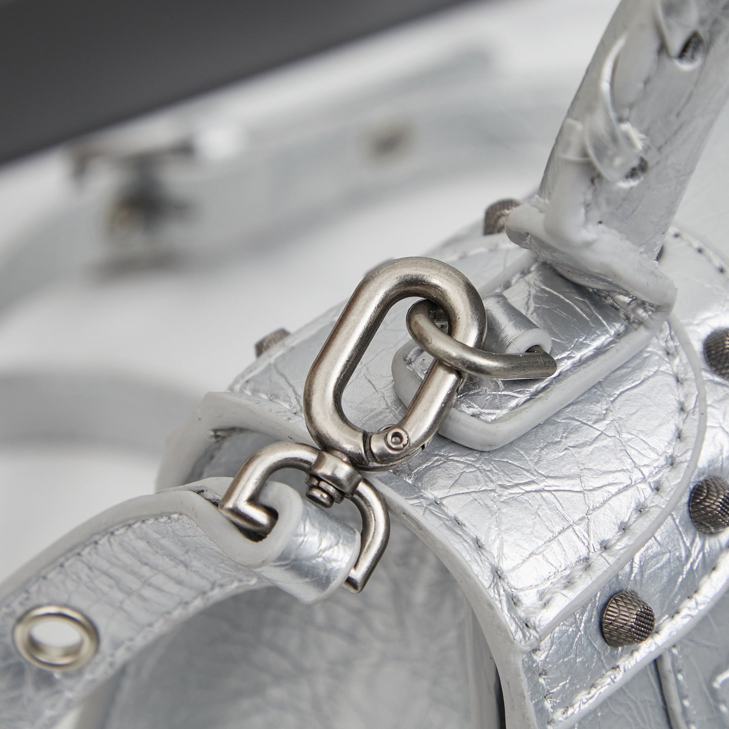 Have you heard of the collaboration between Balenciaga’s Hourglass and Motorcycle bags? Look at this combination of Hourglass and Le Cagole Motorcycle bag. The Hourglass bag body is covered with rose studs from the Motorcycle bag. The black Arena lambskin is full of punk style and quite playful. Size: 23x16x10. Model: 68629 small.
