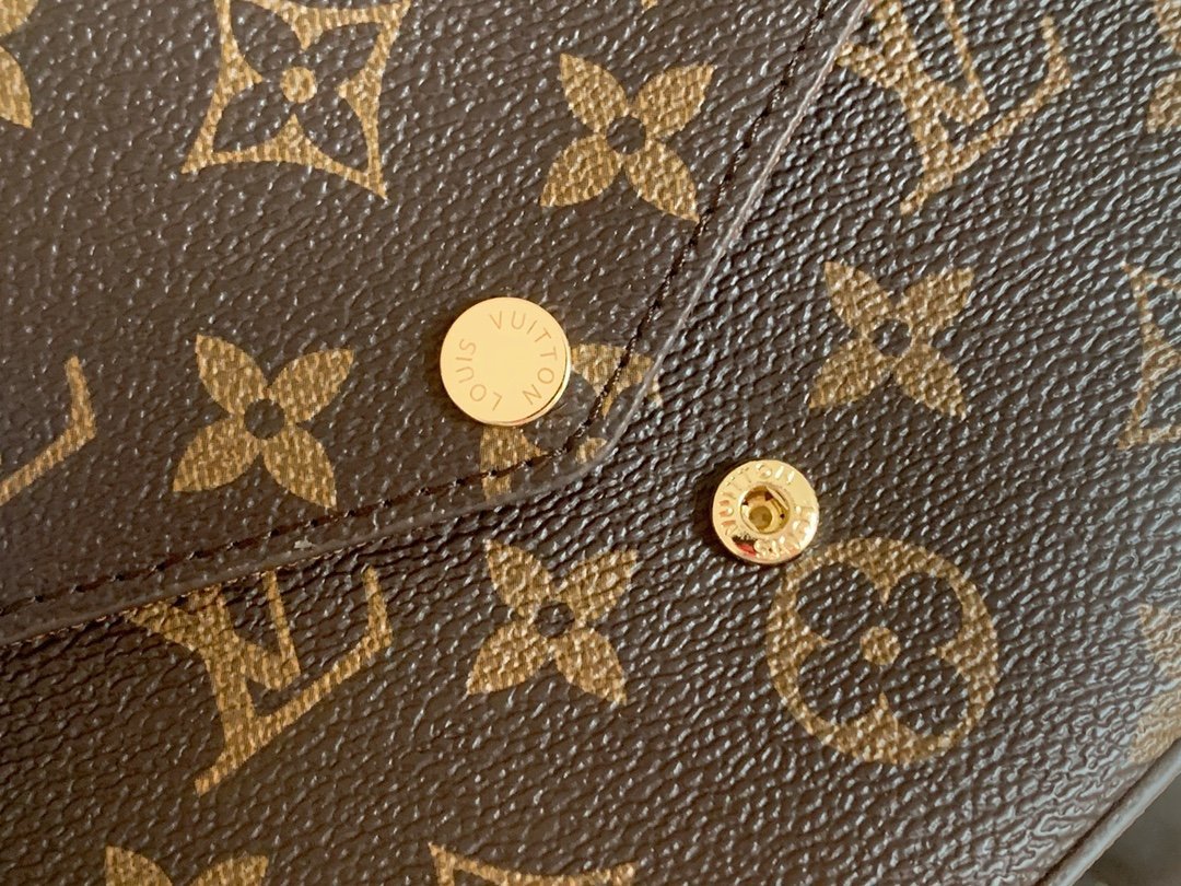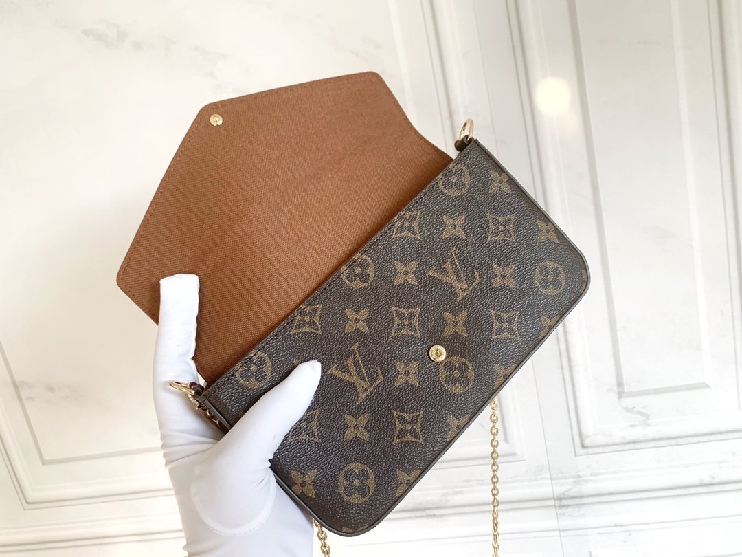 Three-piece set. Model M61276 Felicie handbag is elegant and luxurious. It contains two detachable pockets. It is a fashionable choice for carrying and organizing your everyday items. It is more than just a wallet. After removing the gold chain, it can also be used as a charming handbag or a small handbag. Size 21 * 11 * 2cm