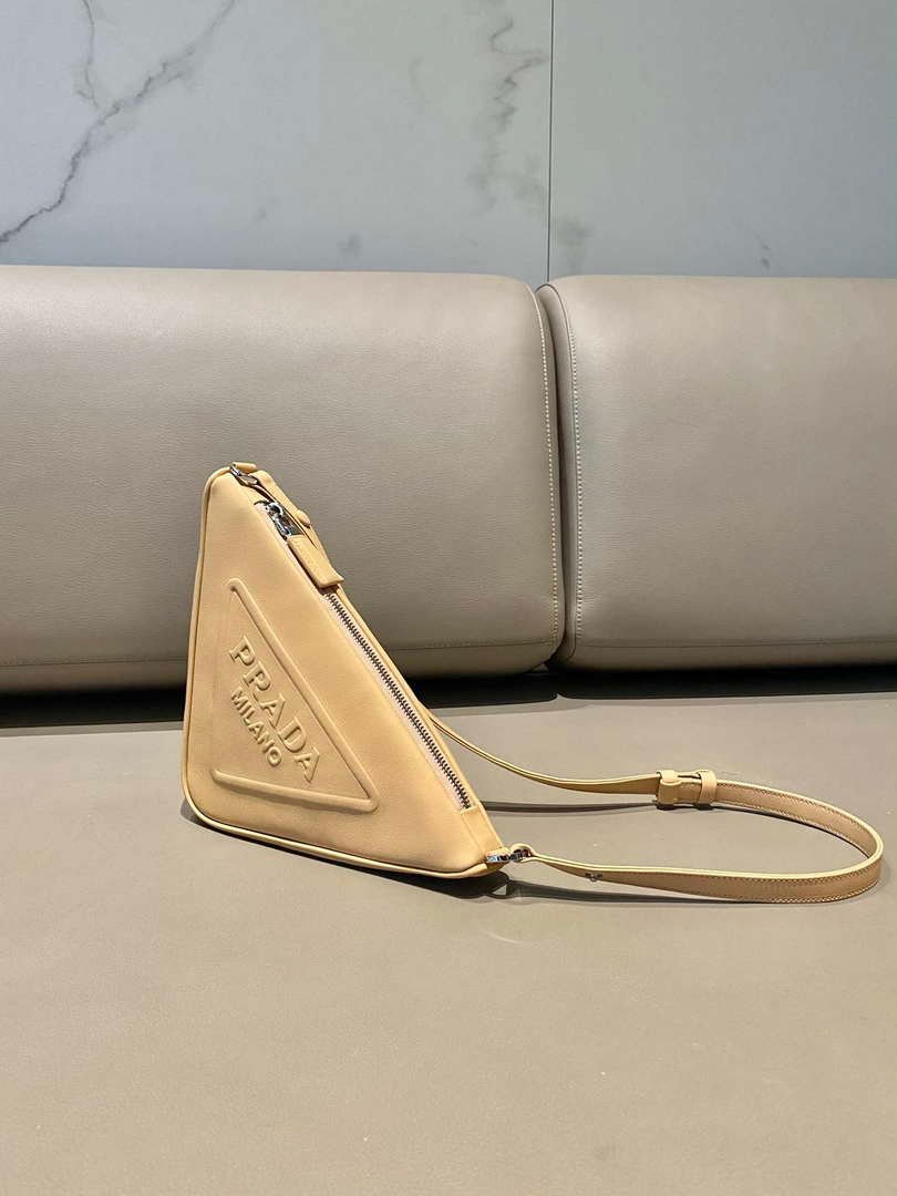 Prada 1NQ043 Triangle leather pouch Apricot on sale now.