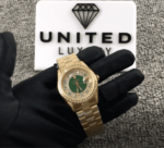 Introducing the Rolex Datejust Yellow Gold Green Dial Iced out 118348 Replica. an exquisite timepiece that redefines luxury with every glance. This astonishing replica. forged with an eye for meticulous detail and superior craftsmanship. stands as an impressive testament to immaculate design and precision. Imagine sliding this magnificent watch onto your wrist – its brilliance catching the light and the gem-set bezel glimmering with every subtle shift of your hand. The allure of the green dial. coupled with the opulence of the yellow gold. creates a visual symphony that captivates and mesmerizes. This Rolex replica not only emulates the grandeur of the original but also ensures you carry a heritage of sophistication and elegance.