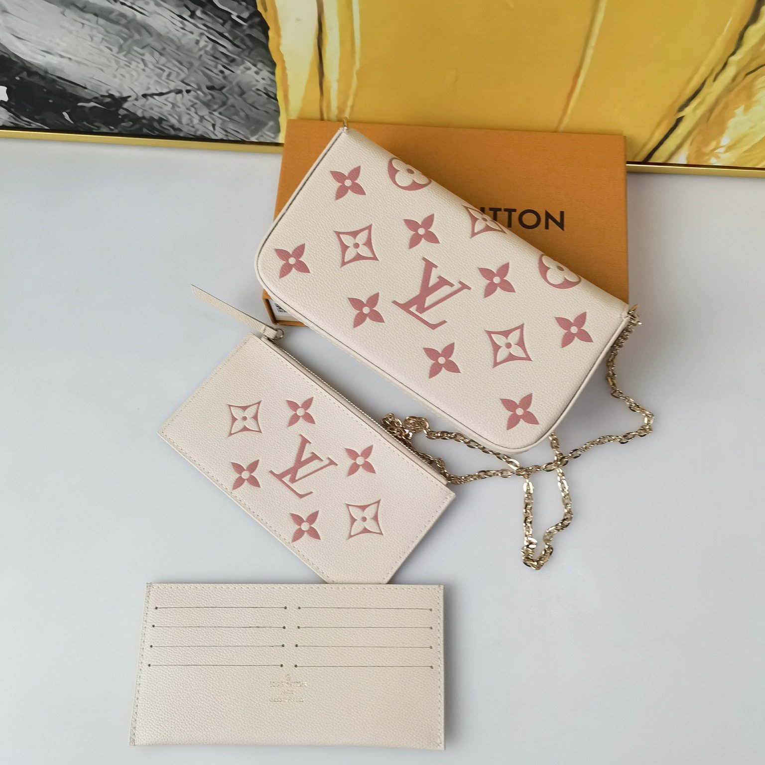 M83025 This season’s Pochette Félicie is reinterpreted in soft Monogram Empreinte leather. The soft two-tone color scheme highlights the embossed letter pattern. A stylish and versatile pouch comes with two removable pockets and a gold chain. You can use it as a shoulder bag or as a clutch after removing the chain. Size: 21*12*3cm.