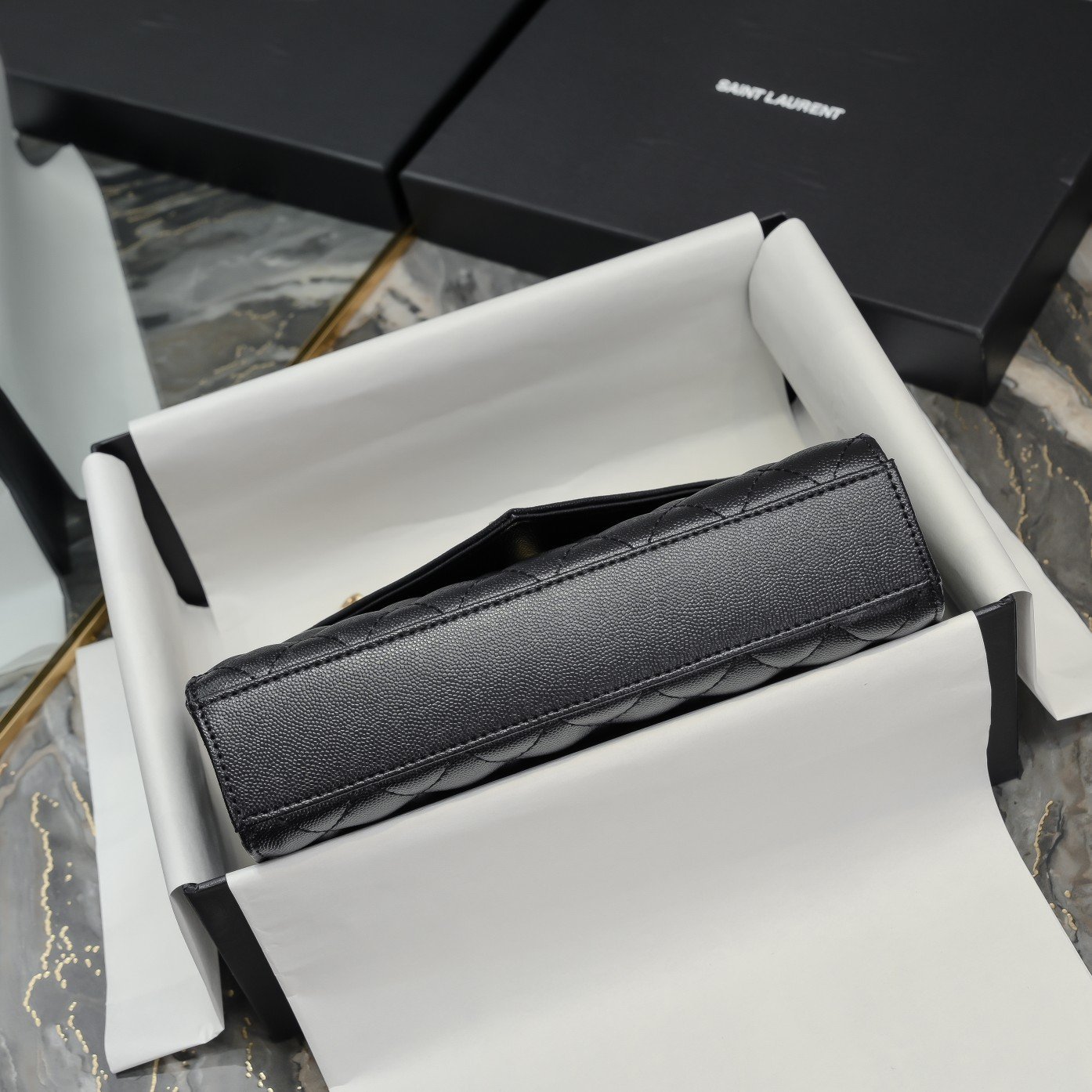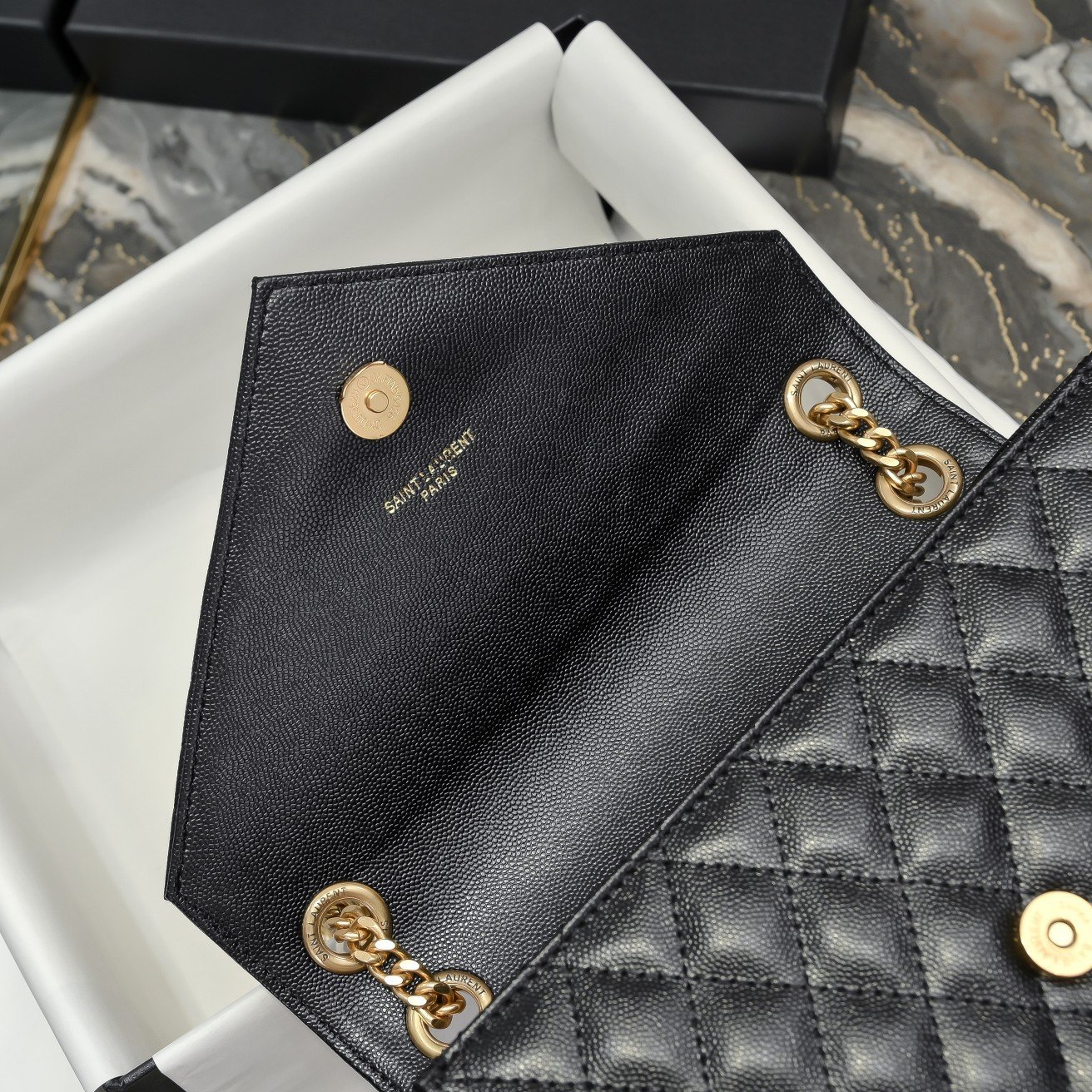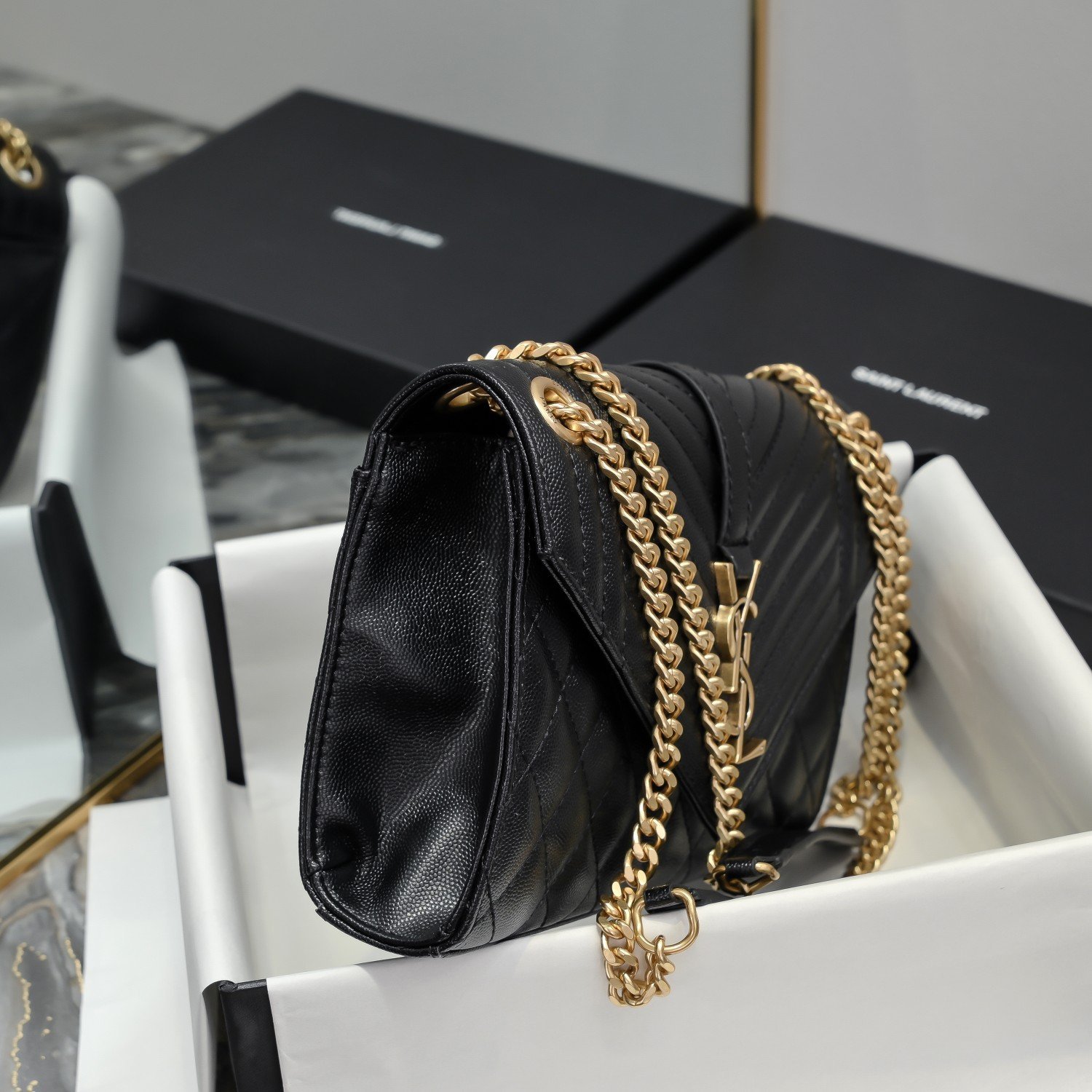 Medium size, Envelope# black with gold buckle. Medium-sized grained embossed quilted genuine leather envelope bag. Classic is eternal. The V pattern combined with rhombus pattern and caviar texture is extremely beautiful. Italian cowhide with a conspicuous Y family logo, integrating elegance and fashion. One chain with three ways to carry: single-chain crossbody, double-chain single-shoulder, and single-chain single-shoulder are all perfect. For fairies of different heights, there is always a carrying method suitable for you. Oh no, it’s the feeling of being enchanted! Model: 48722. Size: 24×17.5x6cm.